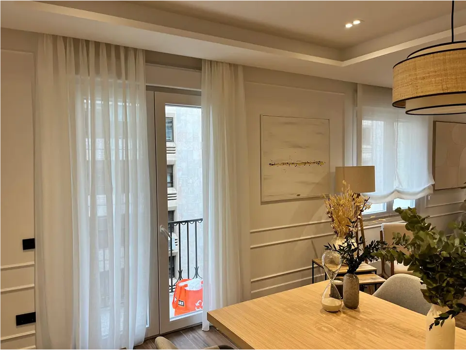 Clásicas y acogedoras, las cortinas fruncidas aportan volumen y textura, creando un ambiente cálido y elegante. Se adaptan a todo tipo de telas (ligeras o con forro térmico/acústico) y son una solución versátil para salones y dormitorios donde se busca una estética más tradicional.