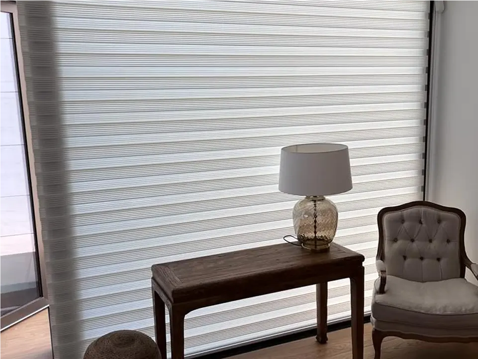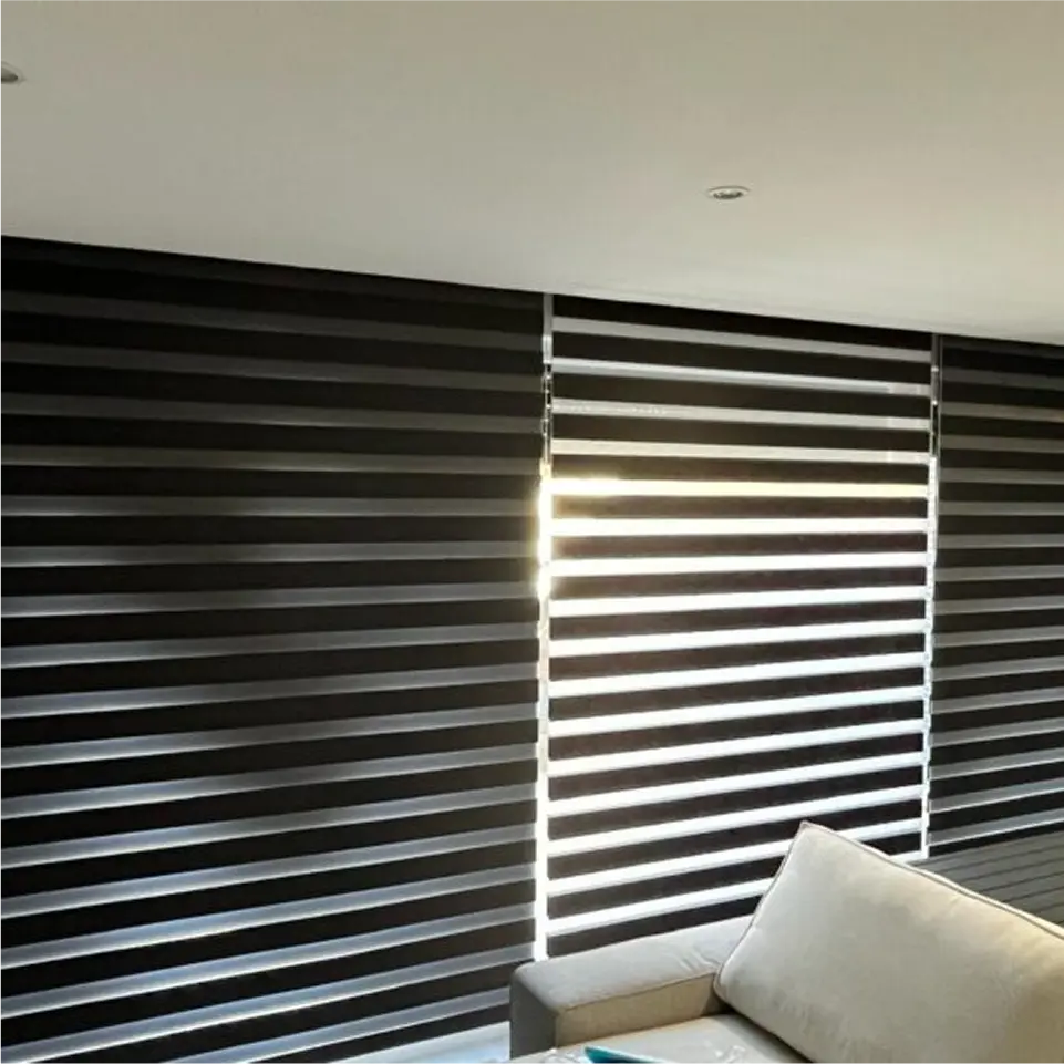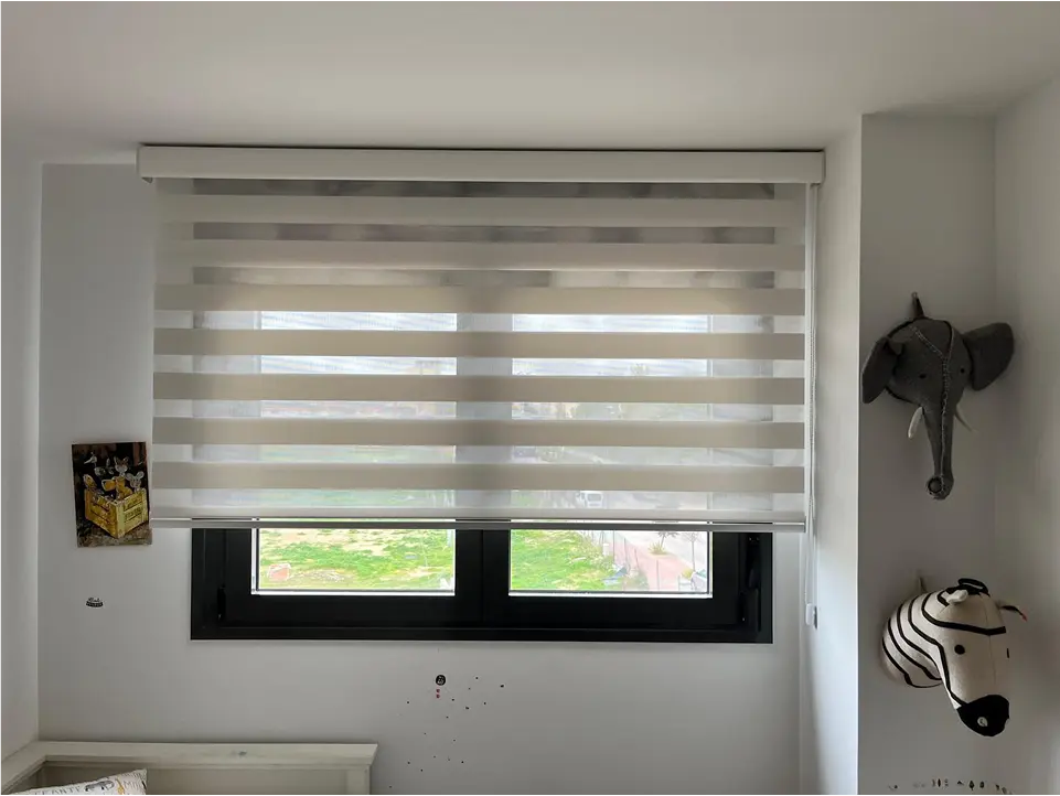 Nuestros estores noche y día son la definición de estilo inteligente. Diseñados para complementar cualquier decoración, su tejido de alta calidad superpone franjas translúcidas y opacas para que seas tú quien decida el ambiente. Permite que la luz bañe tus estancias sin sacrificar la privacidad, o superpón las franjas para crear un entorno más íntimo. Perfectos para salones y habitaciones que requieren un control de luz dinámico y sofisticado.