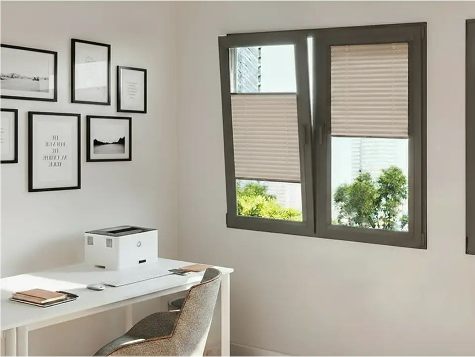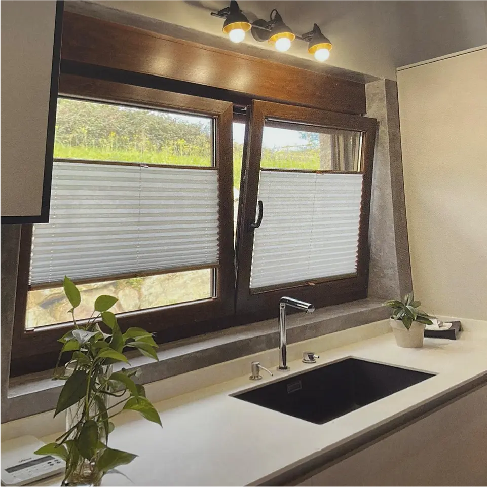 Compactos y versátiles, los estores plisados se pliegan como un acordeón y ocupan muy poco espacio al recogerse; son ideales para ventanas pequeñas, claraboyas o zonas donde se busca una óptima difusión de la luz. Ofrecen opciones de tejidos translucidos o opacos y buen rendimiento térmico.
