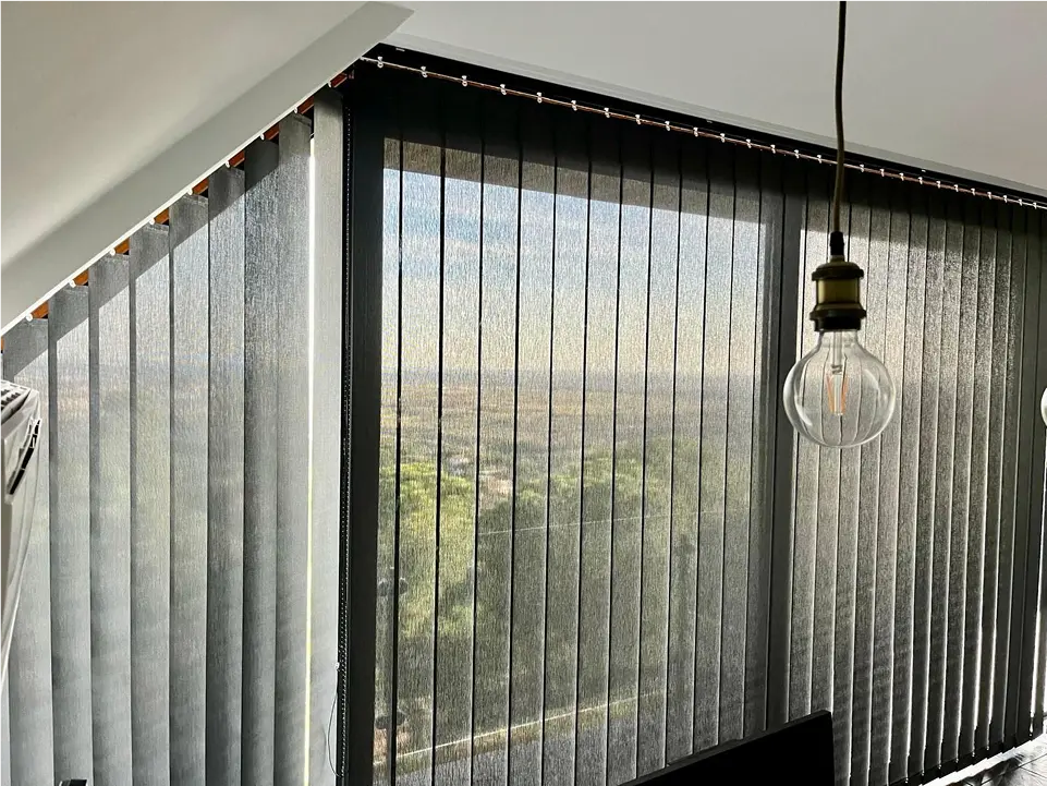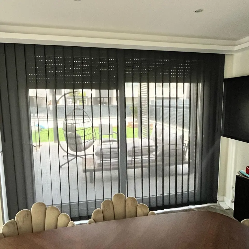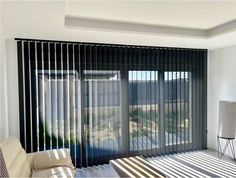 Funcional y discreto, el estor vertical recto es la opción práctica para grandes ventanales y puertas correderas: lamas rectas que giran y se recogen lateralmente, ofreciendo control de luz, privacidad y buena ventilación. Muy apropiado para oficinas y terrazas interiores.
